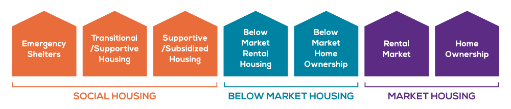 - The “housing continuum” describes the range of housing options people may need throughout their lives as their circumstances change. This includes everything from supportive and subsidized housing to market rental and homeownership.